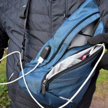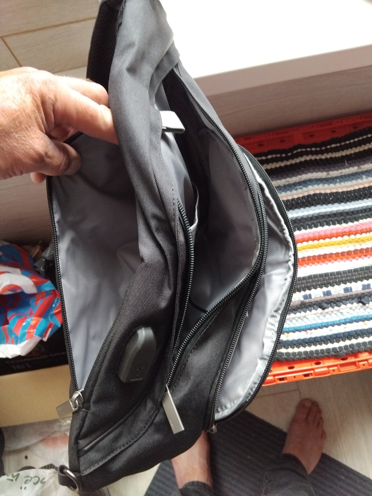 The backpack is lightweight, spacious, and technologically designed for modern everyday life. The material is thick and durable, with a reflective strip for safety at night. The main compartment closes with a zipper, on the side is a built-in USB cable for charging from an external battery, above it is an elastic band with Velcro to secure the cable, the zipper is hidden under a fabric fold, which protects it from rain and leakage. The back is thickened with a special mesh material for more comfortable carrying in hot weather + a side internal pocket with a zipper. The second one closes with a zipper, has pockets for documents, pens, smartphone, and an additional pocket with a zipper on the outside. Adjustable shoulder strap, wide, thickened, soft, with the possibility of hanging glasses on the strap, a pocket with a zipper for a passport, plastic cards, and more. On the side, there is a pocket with a drawstring for an umbrella, water bottles, and a small thermos. I liked it. Thank you.